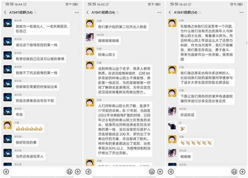 活动开始前,团支书组织班上同学签到,以确保全体同学都能参与本次活动。此次团课活动通过文字、语音、图片与视屏直播等交流形式。团支书首先向同学们概括了此次疫情的发展及影响,同时用实时数据变化加深了同学们对此次疫情严重性的认知;随后,从多个方面讲述了党和政府关于疫情防控的一系列重大决策部署,并向同学们介绍疫情中的杰出人物——钟南山院士、李兰娟院士、张定宇院长、李文亮医生等。在敬佩他们崇高的医德和对疫情防控做出的杰出贡献之余,同学们纷纷表示,作为新时代青年大学生,要以他们为榜样,努力学好专业知识,练就过硬本领,毕业后为人民群众服务,为实现中华民族伟大复兴的宏伟事业奉献出自己全部的力量。接着,参与了返乡大学生团员防疫志愿活动的同学纷纷发表了在防疫期间的经历与感想,也号召同学们要勇于承担“新时代青年的责任与使命”。为增强leyu乐鱼官网团员青年对此次线上团课的参与度,个别班级进行了有关防疫问题的有奖问答活动,同学们踊跃参加,使大家的防疫知识得到提升。最后,全体团员青年对在一线奋战的医护工作者表示诚挚的感谢并致以崇高的敬意。