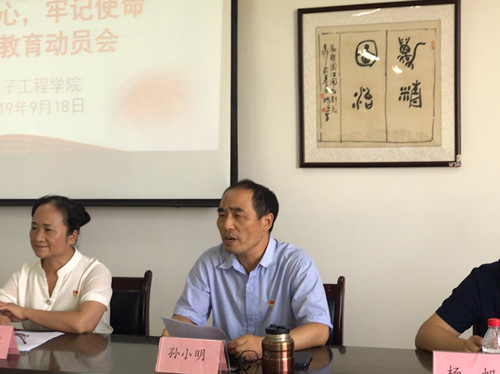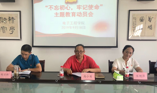 9月18日下午,电子工程学院在竞知楼会议室召开了“不忘初心,牢记使命”主题教育动员会,会议由院长高小英主持,学校主题教育督导六组组长、校纪委办公室主任宋艳萍,督导组成员、电子商务学院办公室主任杨帆到会指导,全体师生党员及两名党外人士代表参加了会议。