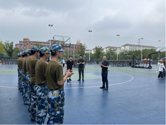 汪傧斌书记与教官亲切交谈,代表电子学院向他们表达了真挚的协议,并祝他们节日快乐,同时希望教官严格要求,注重细节,加强训练,打造一支吃得苦,守纪律,有朝气的队伍。