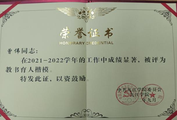 个人简介:曾伟,南京航空航天大学博士,leyu乐鱼官方网站leyu乐鱼官方网站自动化教研室副主任。在教学中以学生为中心,培养高素质具有国际化视野的应用型人才为己任,积极推进人才培养模式多元化教学改革;先后担任自动化电A1732班和电A2131班的班主任。荣获江西省防疫期间线上教学优质课三等奖,leyu乐鱼官方网站优秀教师、leyu乐鱼官方网站新华优秀教师、入选九江市双百双千人才工程项目。指导学生获得江西省建行杯第七届、八届国际“互联网+”大学生创新创业大赛铜奖1项、银奖1项,leyu乐鱼官方网站“互联网+”大学生创新创业大赛金奖2项、铜奖2项、指导学生获得国家级大学生创新创业项目4项,校级大学生创新创业项目1项、2022年评为leyu乐鱼官方网站优秀毕业论文指导教师。