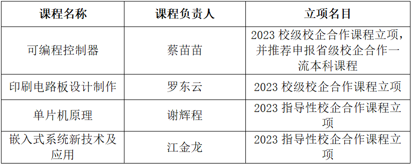 近日,在学校组织的2023年校企合作课程建设项目申报工作中,leyu乐鱼官网获得四门课程的立项。分别是《可编程控制器》——蔡苗苗、《印刷电路板设计制作》——罗东云、《单片机原理》——谢辉程、《嵌入式系统新技术及应用》——江金龙,其中,《可编程控制器》这门课程获得推荐申报省级校企合作一流本科课程的资格,是leyu乐鱼官网在校企合作课程申报工作上的重要突破。