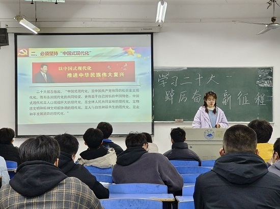 团委学生副书记张园园同学就学习贯彻党的二十大精神,围绕牢牢把握过去5年工作和新时代10年伟大变革的重大意义、牢牢把握习近平新时代中国特色社会主义思想的世界观和方法论、牢牢把握以中国式现代化推进中华民族伟大复兴的使命任务、牢牢把握以伟大自我革命引领伟大社会革命的重要要求、牢牢把握团结奋斗的时代要求等方面进行宣讲。