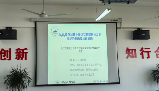 10月22日下午,leyu乐鱼官网电子信息工程专业在竞知楼904会议室举行了学术讲座交流会,由电子信息工程专业教师漆世锴博士主讲,讲座题为《Sc₂O₃掺杂对稀土难熔钇盐阴极热发射性能的影响及机理解释》。讲座由教研室主任谢新文老师主持,教研室全体教师参与了会议。