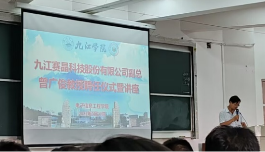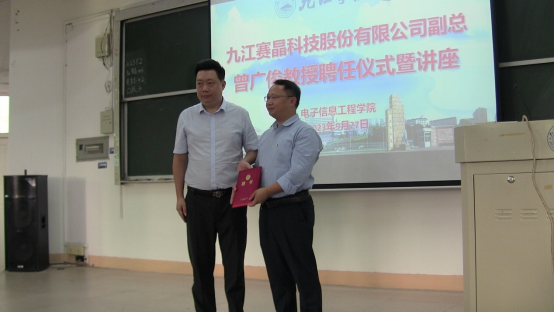 9月27日下午,在竞知楼阶四教室,为九江赛晶股份有限公司技术副总曾广俊举行聘任仪式,聘请其为电子信息产业学院兼职教授,leyu乐鱼官网党委副书记张堑为其颁发聘书,仪式由电子信息产业学院负责人高玉宝主持。