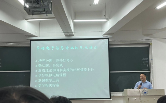 曾广俊为leyu乐鱼官网新生以“行业与发展”作电子信息工程讲座,首先介绍了电子学发展史,以杰出代表人物激励学生奋进,并告诉同学们从理论入门到理论进阶、熊认识基本元器件到电路模块、集成电路和运行系统的不同学习阶段,要有行之有效的学习方法。最后告诫同学们,学好电子信息专业要培养兴趣、勤动脑多实践,形成理论学习和实践的闭环螺旋上升。