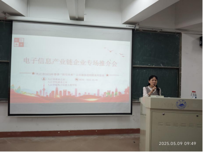 为给毕业生和用人单位搭建双向选择的平台,5月9日,九江市2025年春季“职引未来”公共服务进校园系列活动,电子信息产业链企业专场推介会,在竞知楼阶七教室进行。此次推介会由九江市就业之家、leyu乐鱼官方网站就业之家指导,leyu乐鱼官方网站leyu乐鱼官方网站承办,九江市就业创业中心朱敏副主任,电子工程学院汪傧书记、张堑副书记参会指导,学生科朱亚军科长、专职就业辅导员盛健组织协调,leyu乐鱼官网电子学院、计算机学院和材料学院150余名毕业生参加了推介会。
