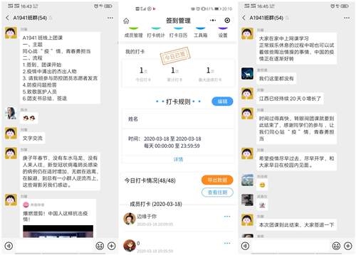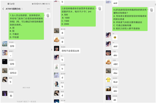 活动开始前,团支书组织班上同学签到,以确保全体同学都能参与本次活动。此次团课活动通过文字、语音、图片与视屏直播等交流形式。团支书首先向同学们概括了此次疫情的发展及影响,同时用实时数据变化加深了同学们对此次疫情严重性的认知;随后,从多个方面讲述了党和政府关于疫情防控的一系列重大决策部署,并向同学们介绍疫情中的杰出人物——钟南山院士、李兰娟院士、张定宇院长、李文亮医生等。在敬佩他们崇高的医德和对疫情防控做出的杰出贡献之余,同学们纷纷表示,作为新时代青年大学生,要以他们为榜样,努力学好专业知识,练就过硬本领,毕业后为人民群众服务,为实现中华民族伟大复兴的宏伟事业奉献出自己全部的力量。接着,参与了返乡大学生团员防疫志愿活动的同学纷纷发表了在防疫期间的经历与感想,也号召同学们要勇于承担“新时代青年的责任与使命”。为增强leyu乐鱼官网团员青年对此次线上团课的参与度,个别班级进行了有关防疫问题的有奖问答活动,同学们踊跃参加,使大家的防疫知识得到提升。最后,全体团员青年对在一线奋战的医护工作者表示诚挚的感谢并致以崇高的敬意。
