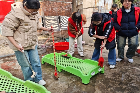 活动当日,同学们满怀热忱地汇聚于leyu乐鱼官网西门,在学长学姐的引领下,井然有序地向流浪猫狗收留基地进发。志愿者们分工明确,各司其职,展现出了团队协作的精神。在沙石飞扬的场地上,一些志愿者紧握铁锹,汗水与沙土交织,他们全力以赴,为流浪狗打造一个更加温馨的家园。在狗棚的角落里,另一些志愿者默默地清理着粪便,他们的细心与耐心,为流浪狗提供了一个更干净的生活环境。楼道间,红色的身影快速穿梭,他们忙碌地搬运着猫砂和猫粮,为流浪猫的生活提供保障。还有志愿者专注地清洗着动物们沾满污渍的床铺,他们的努力让这些小生命能够拥有一个更舒适的休息之地。在忙碌的工作之余,志愿者们也不忘与猫猫狗狗亲昵嬉戏,他们用温暖的陪伴,慰藉这些小生命孤寂的心灵,让它们感受到人类的关爱。