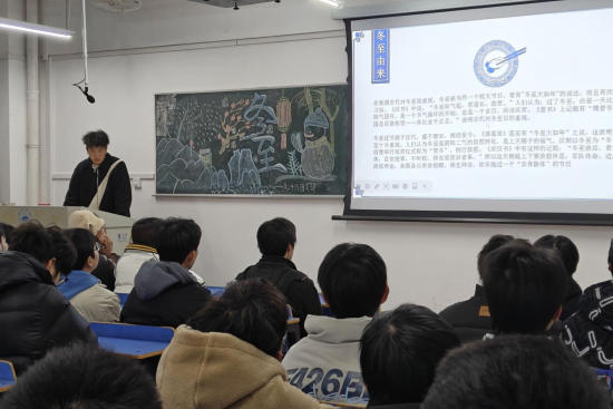 各班团支书通过PPT 展示,向同学们详细介绍了冬至的起源和历史背景,其间穿插了诸多经典的冬至诗词,如“邯郸驿里逢冬至,抱膝灯前影伴身。想得家中夜深坐,还应说着远行人”,让大家在诗意中深切体会到古人在冬至时的复杂情思,深入了解这一节气在古代农耕社会中的重要地位。南方冬至的习俗是吃汤圆,汤圆寓意着团圆和甜蜜;北方冬至的习俗则是吃饺子,“冬至不端饺子碗,冻掉耳朵没人管”的俗语引得台下阵阵欢笑,现场气氛热烈非凡。