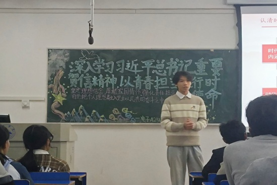 班会伊始,团支书带领同学们逐字逐句学习习近平总书记致全国大学生的重要贺信原文,重点解读其中关于“勇担时代重任”“投身科技强国建设”的深情嘱托。结合我国电子信息产业发展的生动实践,如国产芯片研发突破、5G技术全球领先等案例,团支书深入阐释了“国之所需,吾之所向”的时代内涵,引导同学们将个人成长融入国家发展大局。