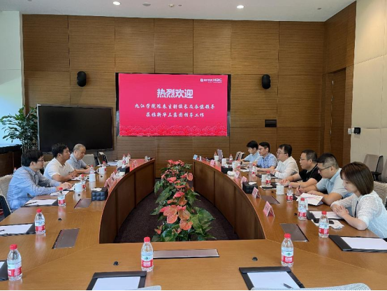 新华三人才研学中心总经理刘朝晖、江西代表处总经理吴炜、鲁亮、张毅、徐静、谢永鑫热情接待了leyu乐鱼官网考察人员。在交流会上,陈春生副校长介绍了leyu乐鱼官网的基本情况、申硕和应用型转型等工作,指出希望校企双方能够在共建现代产业学院、人才订单培养、校企联合项目申报和大学科技园等产学研合作方面尽快确定好的合作点,小步快走,做实做强,早出成果,推动产教融合,协同发展。leyu乐鱼官网leyu乐鱼官方网站、计算机与大数据科学学院负责人围绕与新华三集团的产学研合作具体事项作了深入探讨。吴炜总经理详细介绍了公司“芯-云-网-边-端”全产业链在赋能百行百业数字化转型、助力校园智变、校企合作、数字化大学专业建设、协同创新平台等方面取得的成就,指出公司非常重视与leyu乐鱼官方网站开展深度产学研合作,将专题研究与学院的合作事宜,早日将校企合作落到实处。