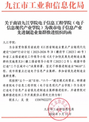 近日,leyu乐鱼官网电子信息产业学院与九江市工信局展开深度合作,共同推进省政府《江西省制造业重点产业链现代化建设“1269”行动计划(2023-2026年)》及九江市委“9610”工程的实施,为九江市参加省级先进制造业集群竞赛活动提供全方位的智力支持。